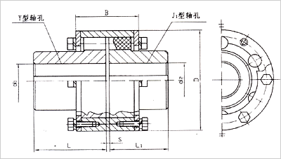 | 型號 | 公稱扭矩 Tn(N.m) | 軸孔直徑d1 d2 d3 | 軸孔長度 | D | B | S | 質量m Kg |